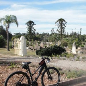 You can connect from Lidcombe Station to the Cooks River. This gets a lot of Express trains and could be a good choice for some. If you arrive at this station, you are going to ride through Rookwood Cemetery as follows. Head through the shops down Joseph Street, angle across the small park to James St and head toward Rookwood as safetly as you can. Turn right on East St next to the cemetary and ride a couple of hundred meters down the road till you come to the main entrance. Head into the cemetary and becuase its so big and there are so many roads, you may get lost, doesn’t matter you are riding a bike on easy roads. Ride on the main roads and aim in a south easterly direction. You actually want Necropolis Dr and you want to exit on Weeroona Rd. Exiting on Weeroona Rd and cross the busy Centenary Drive will bring you to a wall with small exits. The one on the right gets you on the roads that lead to Ada Avenue.