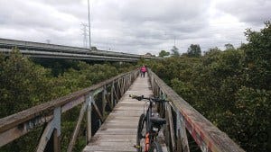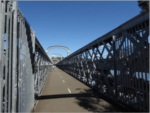 If you ride to Sutherland, there are more adventures including head downhill to the Como Bridge and then ride across that and into Oatley station. You are going to go down some steep hills so the train is a very good idea to get home. One of our routes hugs the railway line and requires you to lug your bike up 50 steps at one point as the road runs out. Much better to do this heading downhill so drivers will treat you well. See the Como bridge and Oakley trail on Google Maps >> Here is the terrific shared path bridge at Como that takes you to Oatley.