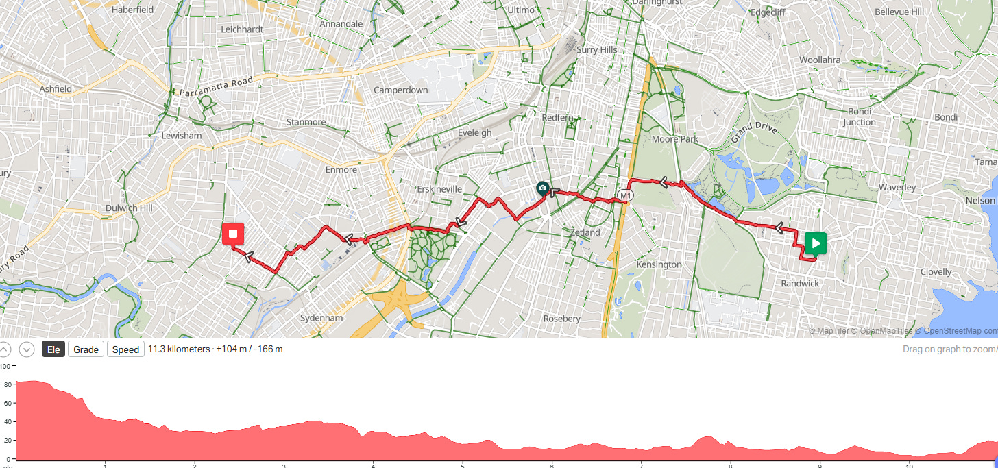 So the route I took featured riding on the south side of Centennial Park, heading through Zetand and down the Bourke St Cycleway and then crossing to Sydney Park. For the streets of Marrickville, I skipped Enmore Park but soon got back to my usual path through the roads of Marrickville. Then I joined the procession of cars to head up Marrickville Rd.