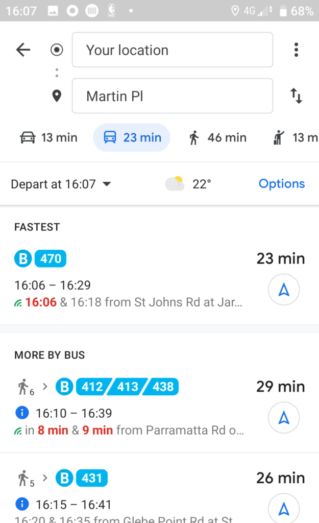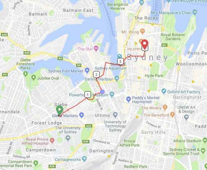 That was all the information I needed, I headed from Centennial Park to Glebe through Sydney University all on shared paths. Then I toddled down some lovely back lanes in Glebe to the Town Hall. Started Strava, take a screen shot of the bus options and I was ready to go (slowly).