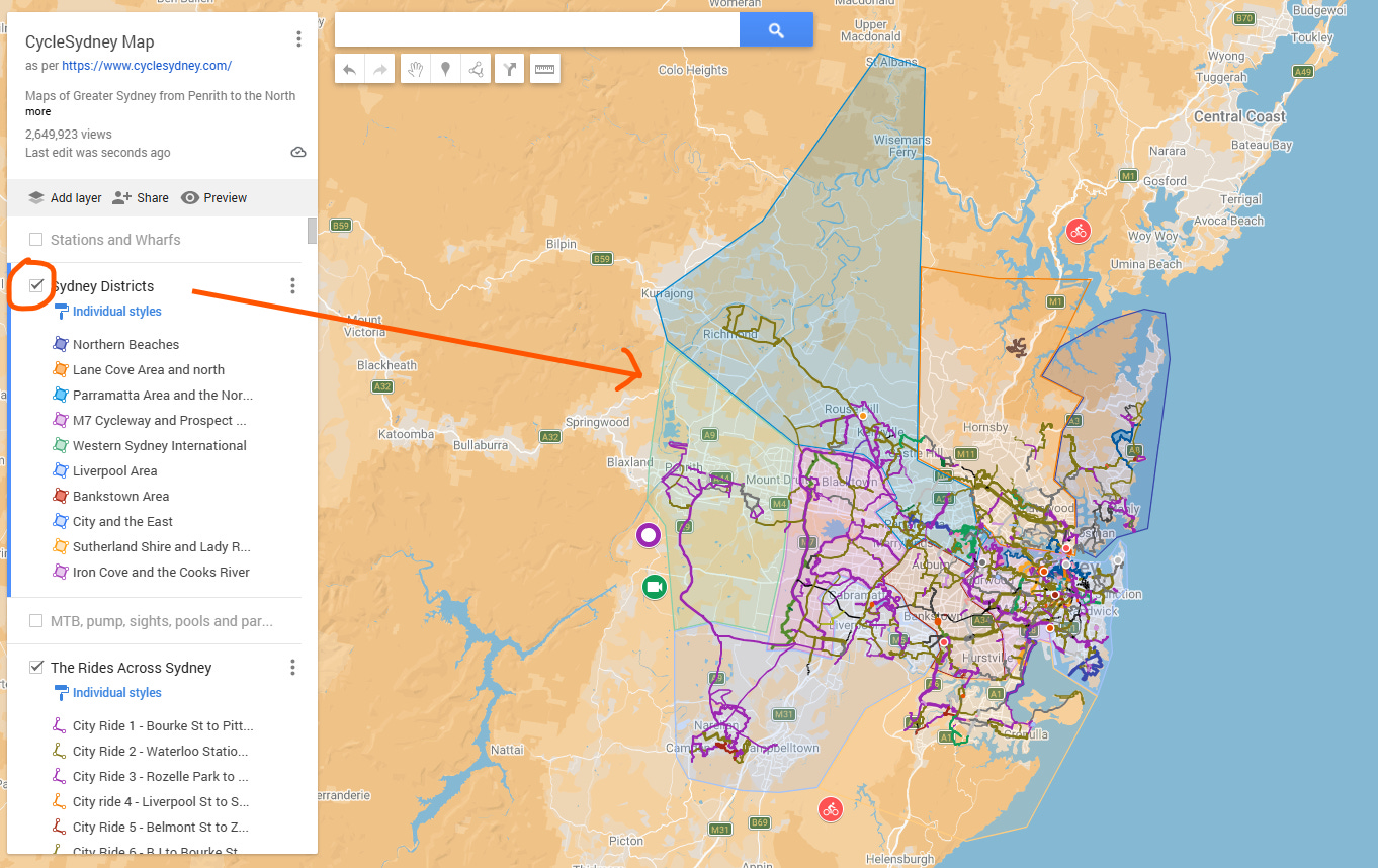 The CycleSydney map has a layer devoted to districts. 99% of the time you will have this turned off. So open the map, find the layers, tick the checkbox to view the Districts.