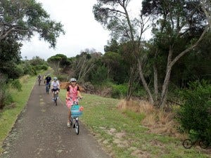 See plenty of photos of the great Yarra Bay beach and nearby Prince of Wales Drive With kids and teens, start at the new Chifley Sports Reserve on Bunnerong Rd. There is a 1 km double lane track around two ovals and a great kids playground and even a skate park. If you actually want to going riding. Safely cross Bunnerong road and head down to La Perouse and Bare Island Fort. It is a spectacular place and lots of wedding photos are taken there. Head down past the fish and chip shops and soon you will be in La Perouse Park. Follow the coast around the bays and past the Botany Cemetery. You can take a up-back on Prince of Wales drive for an extra 4km. Return to your car at Chifley Park down Military Rd and you will have had 10km of pretty safe fun. Notes: Its shared path all the way and only a few road crossings. There is one bumpy section of 200m on the coast. Pretty easy really. When you finish, head to Botany and ride another few km at Sir Joseph Banks Park. That is another kid friendly park. And Heffron Park is not far away >>
