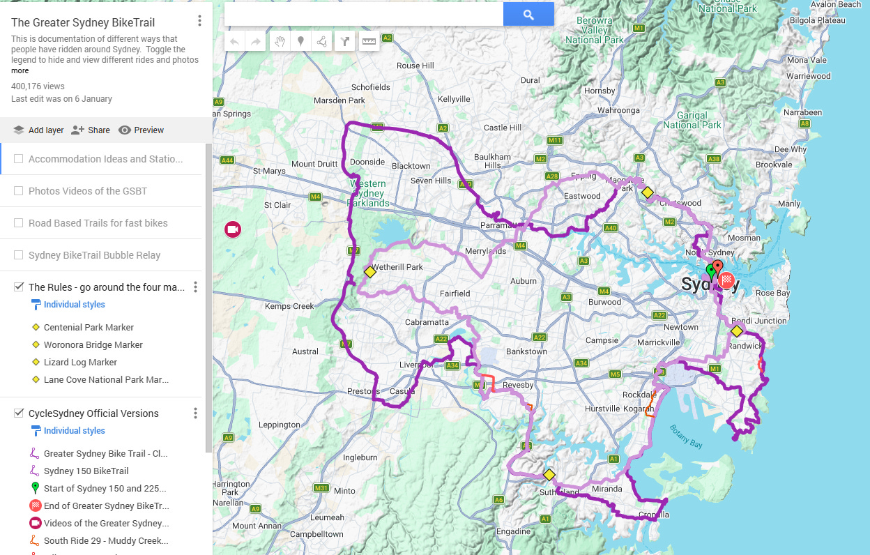 To officially “claim” a completion of the Greater Sydney Bike Trail, you must pass around these four markers. How you navigate between them is your choice, but these are good targets for your journey: