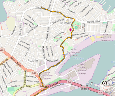 If you want to go to the ferry wharfs, I have mapped out a way to get there that incurs less hill climbing. I would recommend that you understand the Ferry times for both wharfs and where they will take you before you head downhill to the wharfs. Both go to Circular Quay, Balmain East services Milsons Point and Balmain wharf services the Cockatoo Island wharfs. You can do some really cool bike loops of the harbour once you hop on a ferry.