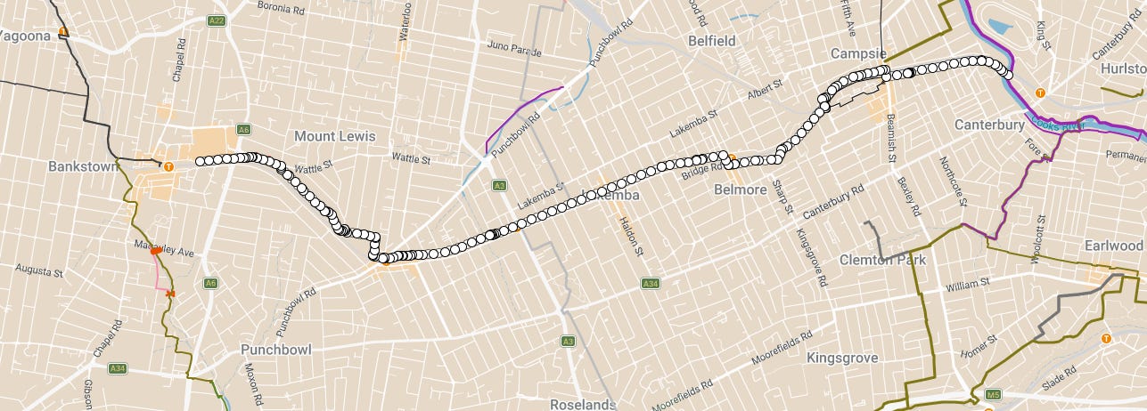 You can turn west near Canterbury using one of three bridges to get to Campsie. From there, it’s a nice ride along the side of the railway to Punchbowl. After that, you can carefully use roads to get to Bankstown. Just west of Campsie you can go south or north of the railway line as shown on the map.
