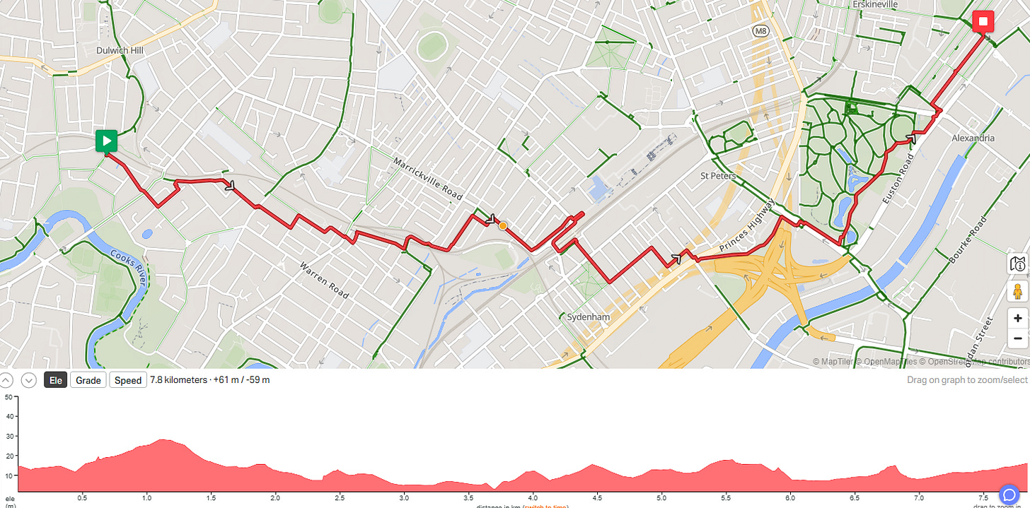 You can follow this track on RideWithGPS. It is called Cooks Ride 24 - Marrickville Railway and Sydenham and goes down the new council Sydenham to Sydney Park cycle route.