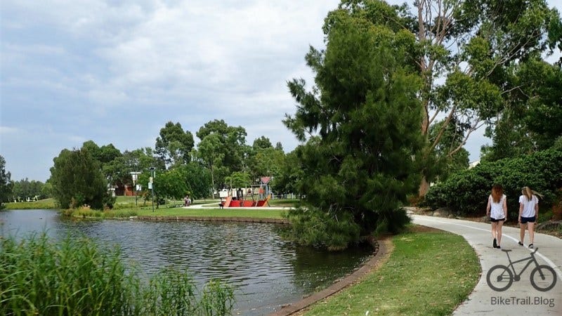 Riding through Mt Annan is fun. The trails are pretty easy and tend to funnel down towards the large Narellan shopping centre and the pool complex. When you cross into Smeaton Grange, the paths aren’t so obvious. In the end you need to get to Bunnings in Gregory Hill where you will cross the Camden Valley Highway