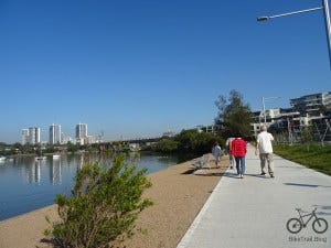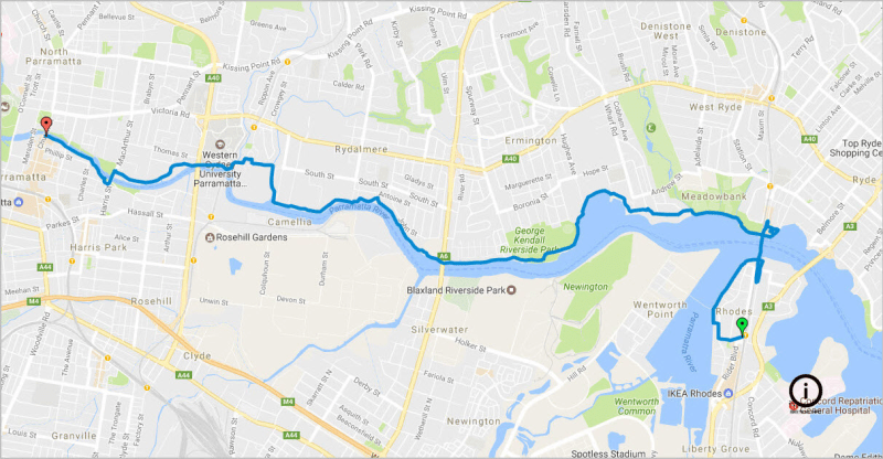See the Mortlake and Putney trail here >> So you can start this ride at Rhodes station or you can drive your bike to Cabarita Park near Mortlake. Now ride along the spectacular foreshore to the Mortlake Ferry where you will be able to go past all the cars and make your way to the bike parking lot. You will be “last on” so park your bike and sit and wait. There are plenty of spots for bikes. When you get off on the Putney side, you will be last off and the cars will have disapeared. At this stage note the time becuase you need to compute when to turn around to catch the ferry back. You now have 15 mins of no traffic to get yourself up the steep hill to Putney park. Follow the unbusy road up to Dyson street. Turn left and maybe walk down the steep hill down to start of the trail. You can now cycle towards Parramatta and turn around at the appropriate time. On the way, you will pass the Kissing Point ferry wharf. If you catch the train to Rhodes, you get to ride the railway bridge across the river. Notes: It is possible to do a loop through Concord Hospital but its impossible to work out where to go so all I can say is just head east and work it out. The track google shows on bike trails is muddy and I couldn’t find the start. You may need to do this loop if you miss the ferry. You can also head east from Cabarita Park to Canada Bay but there are a lot of houses and even a section where the aged residents ask you not to ride. At this stage, you will need to walk your bike 400m. I would only do Canada Bay once, heading to Parramatta and Olympic Park is way better riding. For smaller kids, stick to the Mortlake side which is 2km long. Its another 4km up to the Rhodes railway bridge from Putney. See the combined map of Parramatta River Bike Trails Here >>