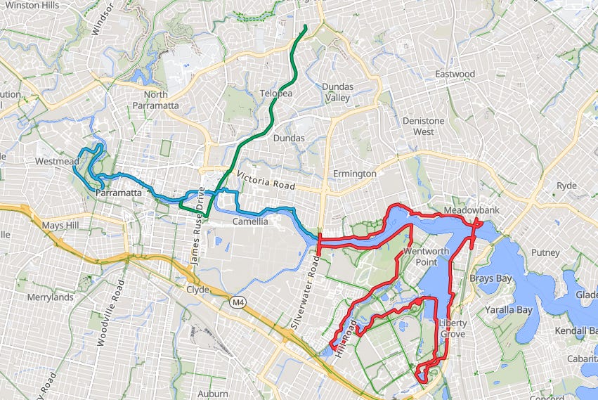 Finding your way thru Parramatta is really complex. Here are the trails that we think are good enough to use to cross from north to south, take it easy Here is the council map and here are photos from Parramatta Park to the M4 on the best of the worst options