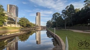 The Parramatta area is crisscrossed by great trails starting with the Parramatta to Meadowbank path. From this path you have two bridge options to Olympic Park and Rhodes. Further towards the city is the Putney ferry trail and the convoluted Olympic Park to Cooks River Cycleway. Recently added is the wonderful Carlingford Rail Trail with the two new bridges across the Parramatta River. Other options include the dull M4 Cycleway and the back roads to Parramatta Lake via Parramatta City.