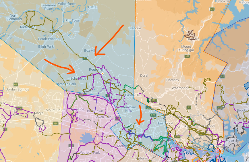 Green is the Bella Vista to Schofields video path and Red is the route of the Smalls Creek and Windsor Rd Video