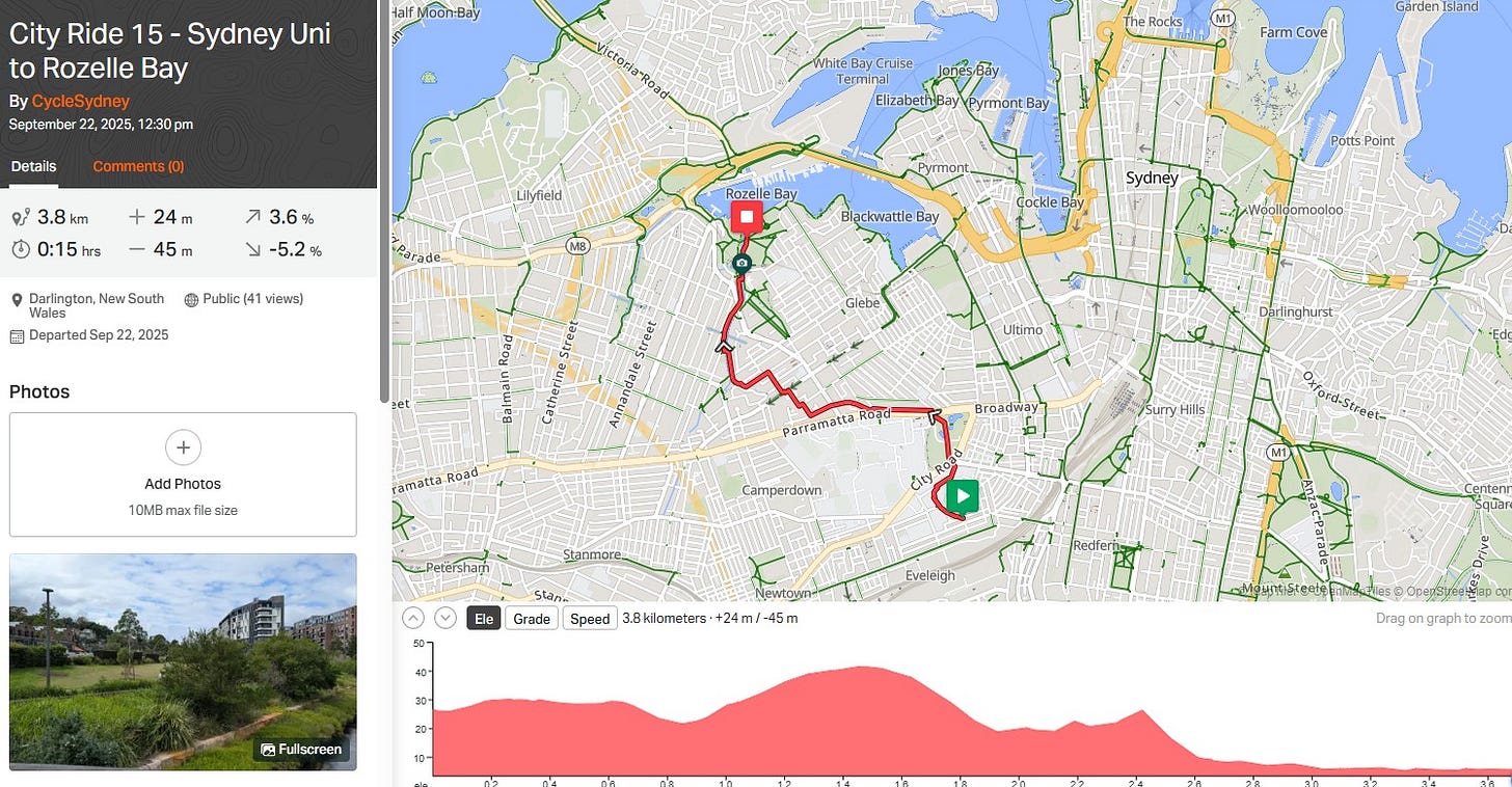 City Ride 15: A direct urban link through university grounds and historic Glebe to the Rozelle Bay.