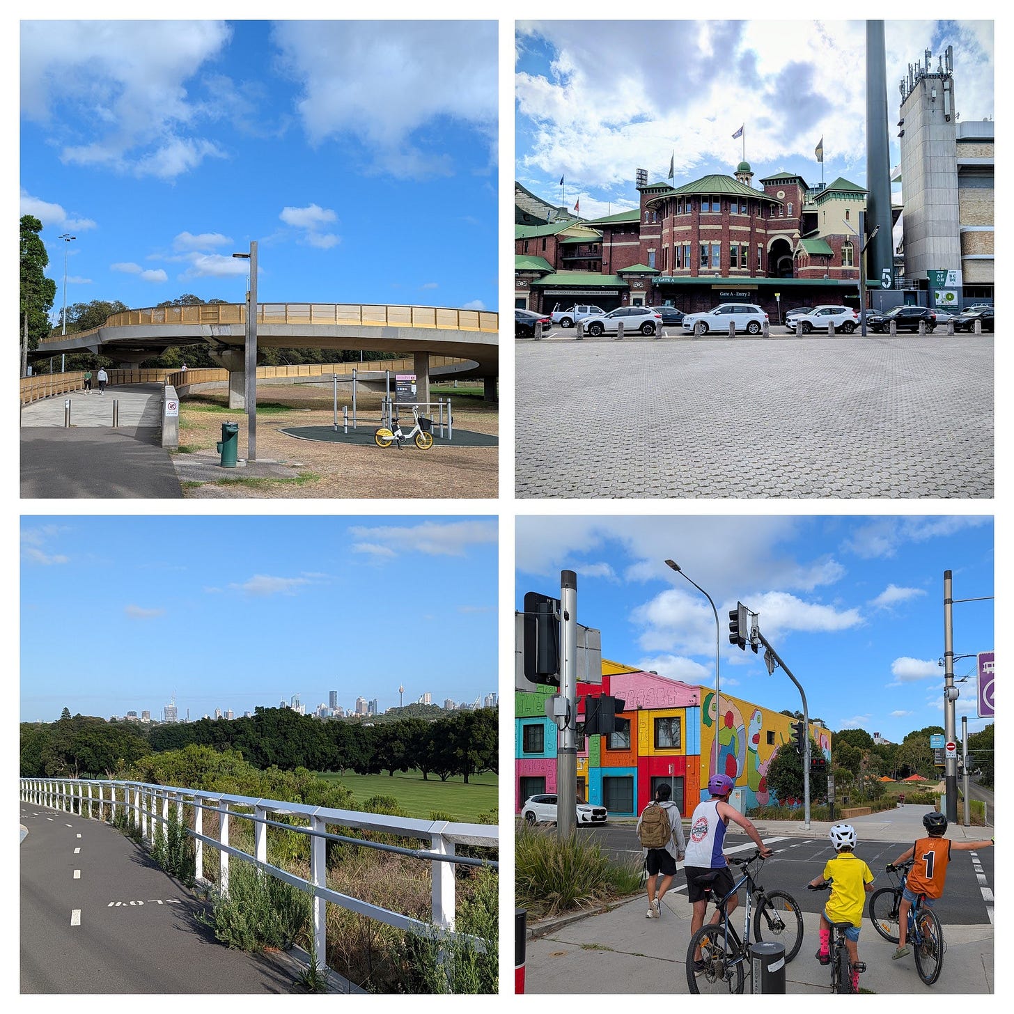 As we exit the park and transition into a more urban commute, we zip along Federation Way. This stretch takes you past the iconic Sydney Cricket Ground and the Sydney Football Stadium, where on game days you’ll see large numbers of share-bikes avoiding the busy trams. Of note here is tackling the unique spiral design of the Albert “Tibby” Cotter Bridge. This pedestrian and bike bridge soars over bustling South Dowling Street and the light rail line, offering spectacular views before a quick descent toward our destination.