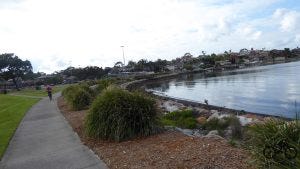 So armed with my google design maps, I rode along Botany Bay with my wife and lunched at Ramsgate. There are three cafes there near Coles. I left her at Alice St in Sans Souci and headed west along the council paths. Just past Kogarah Bay, I joined the road that hugs the bay until near Carrs Park. I rode through Carrs Park being careful not to disturb the older people that frequent the area. Some paths are definitely not for cycles. Benwerrin Avenue is the official council path near Carrs Park. In Carrs Park near the Highway is a cool kids cycle area with some bumps and things for them to experiment on.
