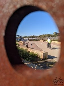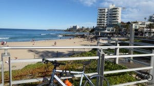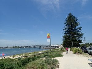 Now to ride to Cronulla Beach After this, you will enjoy lovely mangrove cycling on shared path and wooden bridges till you turn to arrive at Captains Cook Drive. Cross to the other side of the road where the track continues on a double lane concrete trail. Follow that through to the end of Cronulla Golf Course. There is a busy intersection that you need to cross with care. When Captain Cook drive turns North East, you head up Bate Bay Drive which turns into a steep hill past a new housing estate. At the top you will be at Wanda Reserve and Cronulla is south about 3 km on the very wide concrete path. At Wanda Reserve is a kids play ground and a good kids bike track that runs for 500m or so. When you arrive in Cronulla, you are not allowed to continue along the coast according to the signage. You have to go up the roads. So your journey ends here and its a good place to stop. Notes: Cronulla Station is very close so if you have travelled from the Inner West or Strathfield, relax and catch the train home. Another thing to consider is the wind. Train to Cronulla and ride back with a southerly sounds like a plan. See the Botany Bay trails on Google Maps >> The photos start at Taren Pt and follow through to Cronulla
