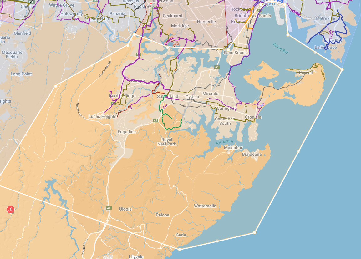 Look for the purple line from Shark Park on the water to Caringbah Station (which is terrific) and then the decent path from there past the hospital and onto towards Miranda shops. Map link here