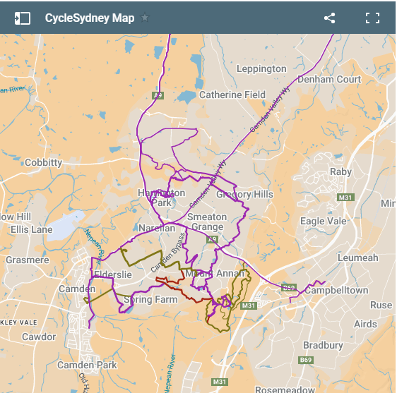 The shared path from the M7 Cycleway to Macarthur Station is 98% shared path cycleway. It follows Narellan Rd and then the Camden Valley Way. On Narellan use the south side with a little back roads near the swimming complex. On Camden Valley its all on the western side, take care on the road crossings. At the northern end of Camden Valley Way, use the north side and watch out you dont follow the cycleway all the way to Leppington. If you are happy with 30kms riding, head to Glenfield Station down the Glenfield Rd and return by the train. A number of road cyclist were on the Camden Valley Way and not on the cycleway. It looked smooth but I was happy with the path. Add this trail to the M7 Cycleway for a monster ride. The purple line at the bottom of the Western Parklands map >> If you like exploring suburbs, Narellan, the suburbs of Mt Annan, Smeaton Grange, Harrington Park and Oran Park are good fun and will probably suit slower riders than the one way roads around Mt Annan. See a video on Harrington Park