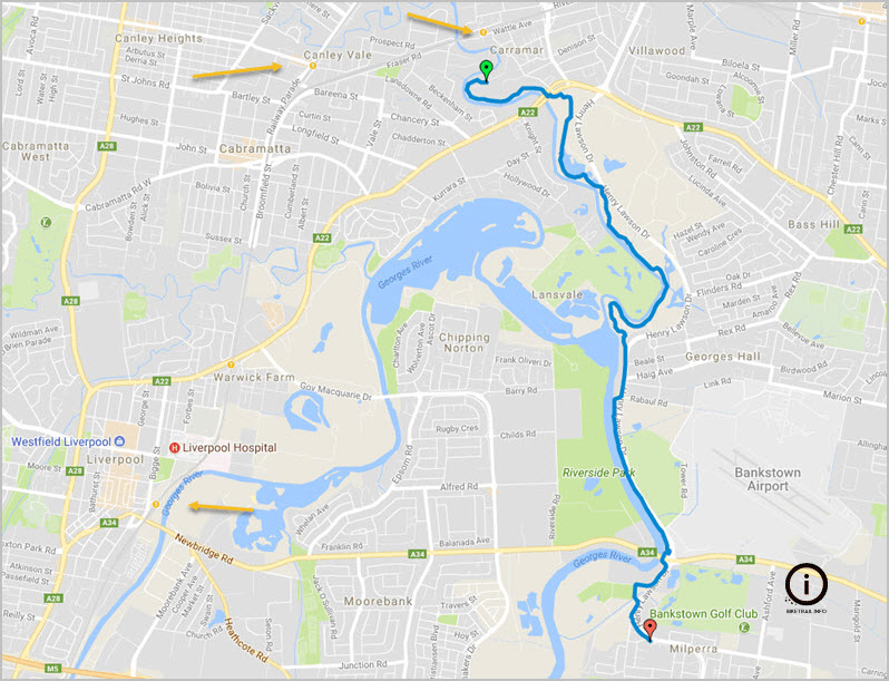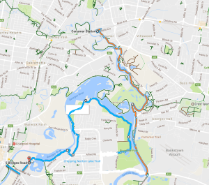 This 16 km return trip from Liverpool Station is a great park ride. The trail starts at Lake Moore, jumps on a road for 2km and then follows the Georges River through parklands until the official version of the trail comes to an end. The ride is a bitumen surface with the odd tree root undulating the surface every now and again. (See Video here) You can take your kids to any section of this ride and they will enjoy it. If you come from Liverpool station you need to manoeuvre yourself across a bridge and through some warehouses before you come to the start of the trail at Lake Moore. I especially recommend it if there is going to be mist on the lakes because it was quite spectacular at 8am on a sunny day in May. Riding in See trail on Western Parklands Map >> Notes: Whilst it looks tempting to ride on through to the Carramar trail using Arthur St, this road is closed and very isolated. Riding along the north side of Newbridge Road is next to the very busy road but it has been improved in part with a shared path in 2018. As there are so few coffee shops on offer, I suggest the one in Alfred St, Chipping Norton. A good connection to this path is to ride from Glenfield station to Liverpool >>
