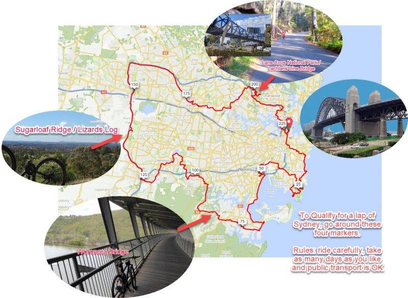 Here are the rules for going around Sydney. Go around the four yellow markers in the map above. End of rules. You can do this using trains as long as your bike accompanies you. Here are the markers in more detail.