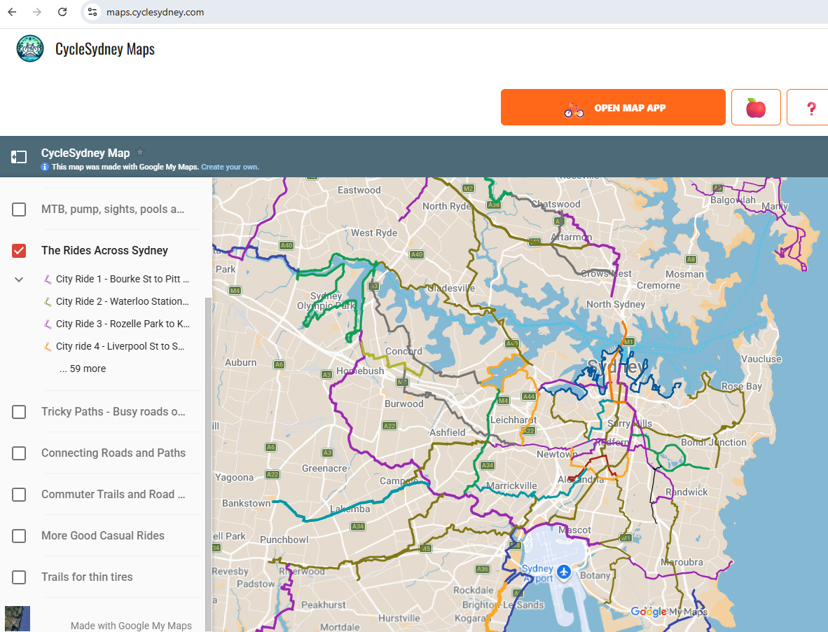 The biggest change is how you access our data. I’ve built a dedicated “launchpad” for our custom route guides at maps.cyclesydney.com.