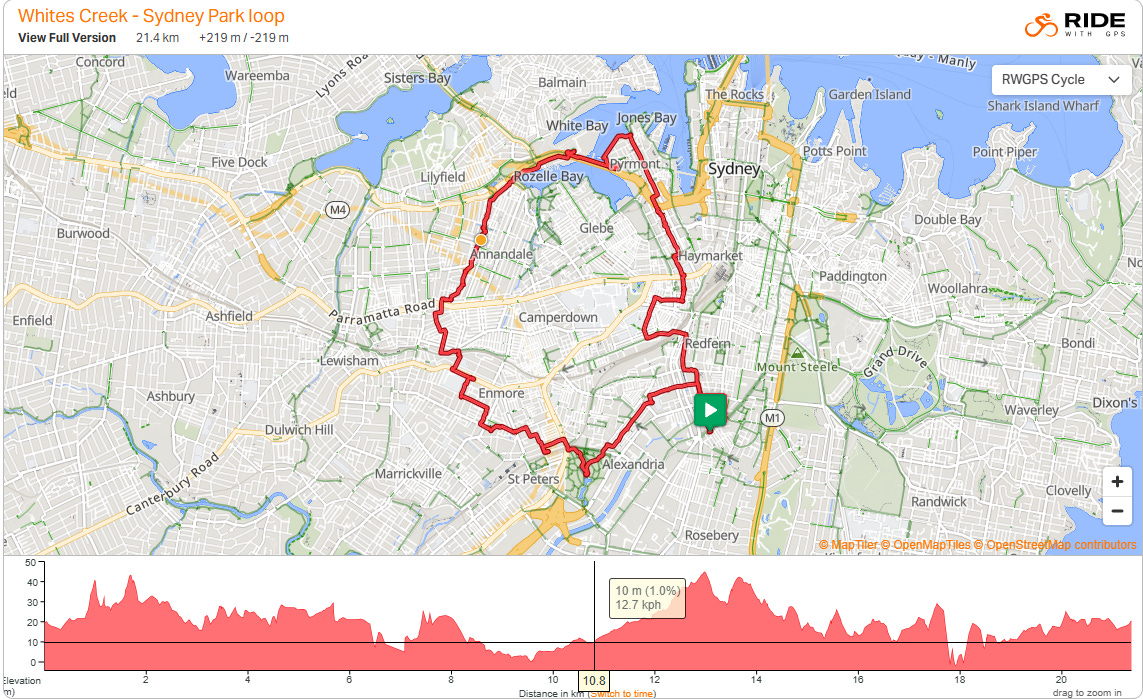 On a really nice Saturday in January, I headed off to try and find a workable easy way to connect the wonderful Whites Creek Lane bike path in Annandale with the equally wonderful Sydney Park in Erskinville. That meant I would have to ride down to Pyrmont and head over the Anzac bridge and then loop around through Annandale and Stanmore to get to Sydney Park. It was a good ride as the pictures show and I knew it would be best on a Sunday morning when there are no cars around. So the very next day, I took my wife in the opposite direction (clockwise) by first heading through Stanmore. I actually thought that worked better. There was 200m of climbing. Further descriptions follow the pictures.
